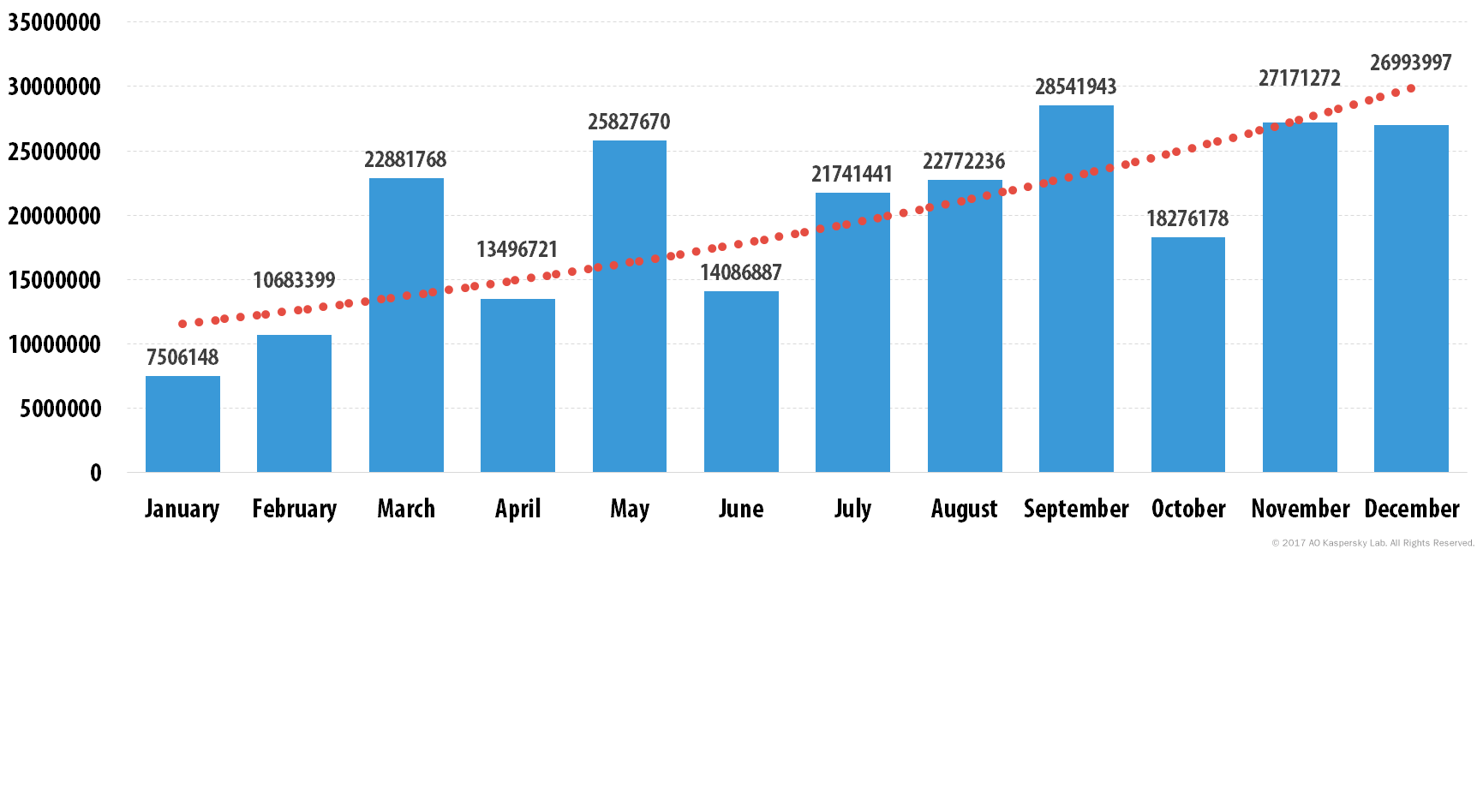Ο αριθμός των κακόβουλων προγραμμάτων άρχισε να αυξάνεται το Δεκέμβριο του 2015 και συνέχισε να αυξάνεται κατά κύματα καθ ‘όλη την επόμενη χρονιά. Οι απότομες μειώσεις προκλήθηκαν κυρίως από το γεγονός ότι οι ψηφιακοί εγκληματίες απενεργοποίησαν προσωρινά το botnet Necurs, που είναι υπεύθυνο για το μεγαλύτερο βαθμό εξάπλωσης του Locky.