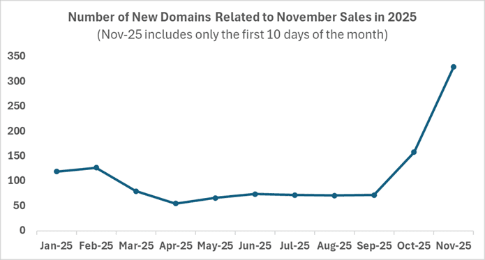 • 519 νέα domains σχετιζόμενα με Amazon/AliExpress/Alibabaκαταχωρήθηκαν μόνο τον Οκτώβριο — αύξηση 24% σε σχέση με τον Σεπτέμβριο (1.288 domains) και 12% σε ετήσια βάση. Από αυτά, 1 στα 25 χαρακτηρίστηκε ως κακόβουλο.