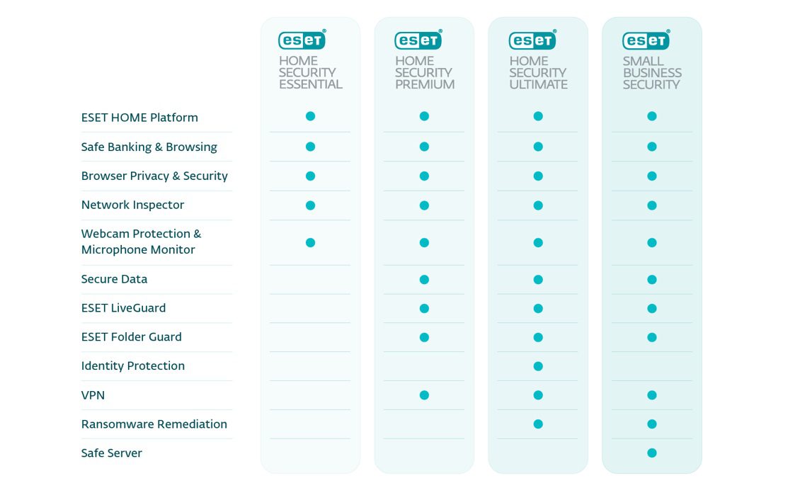 Τα προϊόντα ESET HOME Security και ESET Small Business Security είναι διαθέσιμα σε όλα τα κύρια λειτουργικά συστήματα — Windows, macOS, Android και iOS — και καλύπτουν όλες τις συνήθεις συσκευές έξυπνου σπιτιού. Επιπλέον, το ESET Small Business Security προστατεύει και τους διακομιστές Windows. Τα ενημερωμένα προϊόντα έχουν σχεδιαστεί για να αντιμετωπίζουν το εξελισσόμενο τοπίο απειλών, με ιδιαίτερη έμφαση στην πρόληψη, εξασφαλίζοντας την καλύτερη δυνατή εμπειρία χρήστη, καθώς η πραγματικά αποτελεσματική ασφάλεια στον κυβερνοχώρο πρέπει να είναι εύκολη στην εγκατάσταση και τη διαχείριση.