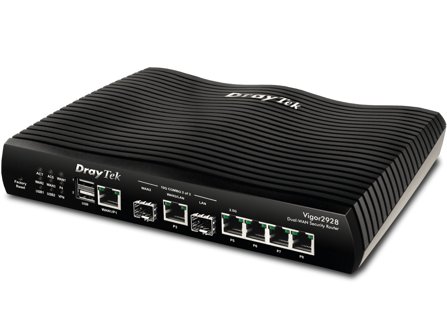 Η σειρά Vigor2928 αποτελεί τη συνέχεια της επιτυχημένης σειράς Vigor2927 και προσφέρει πολλαπλές επιλογές θύρων 10GbE και 2.5GbE, συμπεριλαμβανομένων παραμετροποιήσιμων 10GbE & 1GbE θυρών WAN/LAN, 10Gbps SFP+ WAN, 10Gbps SFP+ LAN, 2.5GbE LAN και τριών GbE LAN.